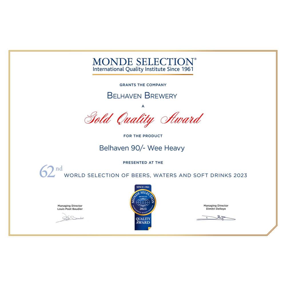 Monde Selection Gold Quality Award for Belhaven 90/- Wee Heavy 2023