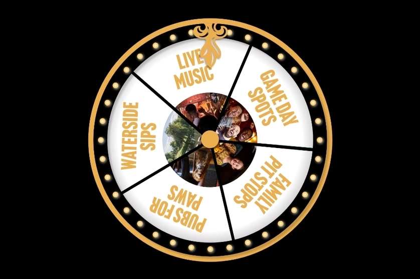 A graphic banner of a spin the wheel landing on 'Live music' for Greene King Belhaven venues.